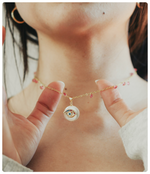 Este collar combina la resistencia del acero inoxidable con la belleza suave del nácar en un diseño lleno de significado: un colgante en forma de ojo, como símbolo de protección y sabiduría.