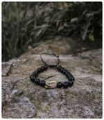 Inspirada en la transformación, la intuición y la fuerza interior, esta pulsera hecha a mano presenta piedras negras de onix de intenso brillo que enmarcan una serpiente dorada con detalles brillantes.