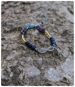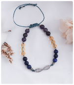 pulsera en lapizlazuli, cuarzo citrino y amatista con centro infinito en rodio