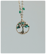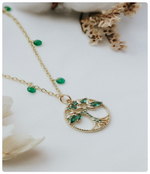 Collar de acero inoxidable con árbol de la Vida en el centro, rodeado por sutiles destellos verdes que evocan la armonía de la naturaleza que  simboliza la fuerza, el crecimiento y la prosperidad.
